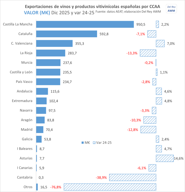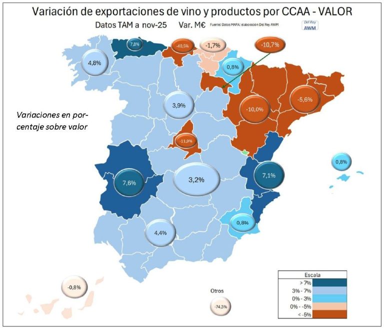Dentro de la atonía general de las exportaciones españolas de vino y productos vitivinícolas en el interanual hasta el pasado mes de noviembre – últimos datos de la AEAT analizados por Del Rey AWM – que cayeron ligeramente en valor (-1,9%) con un ligero descenso en volumen (-1,5%), por mínima bajada del precio medio (-0,4%), las ventas exteriores de diferentes comunidades autónomas muestran diferencias relevantes.
