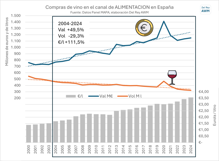 Las compras de vino en alimentación, con caída en volumen pero importante crecimiento en valor, se han ido concentrando en personas mayores de 50 años, hogares sin hijos y poblaciones medianas.
