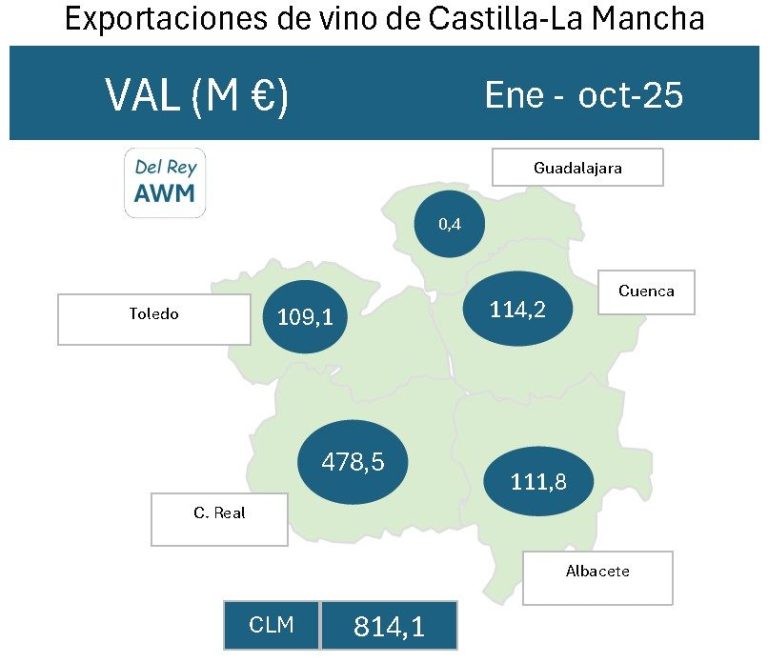 Exportaciones de vino y productos vitivinícolas de Castilla-La Mancha a octubre 2025.
