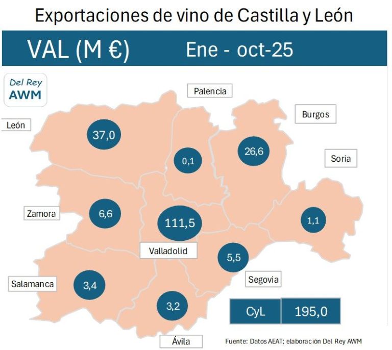 Según los datos de la AEAT analizados por Del Rey AWM, en 2025 España exportó vino y productos vitivinícolas (vinagre, mosto, zumos de uva y vermuts) a 189 mercados diferentes en el mundo, lo que supone 8 menos que el año anterior y que hace 10 años. En total, las ventas internacionales del pasado año alcanzaron los 3.452,7 millones de euros por el envío de 26,8 millones de hectolitros, de los que el vino propiamente dicho supuso 2.900 millones de euros y 19,1 millones de hectolitros respectivamente.