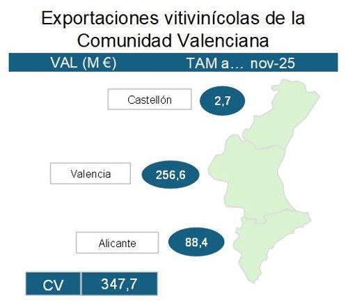 Las exportaciones de vinos y productos vitivinícolas desde la Comunidad Valenciana aumentaron un 8,7% en volumen y un 7,1% en valor en el periodo interanual a noviembre de 2025, hasta alcanzar los 368 millones de litros y los 331 millones de euros. El precio medio bajó un leve 1,5%, hasta los 94 céntimos por litro. Respecto al interanual a noviembre de 2024, la región ha incrementado sus ventas exteriores en 30 millones de litros y en 22 millones de euros, cobrando notable relevancia entre las exportaciones vitivinícolas españolas.