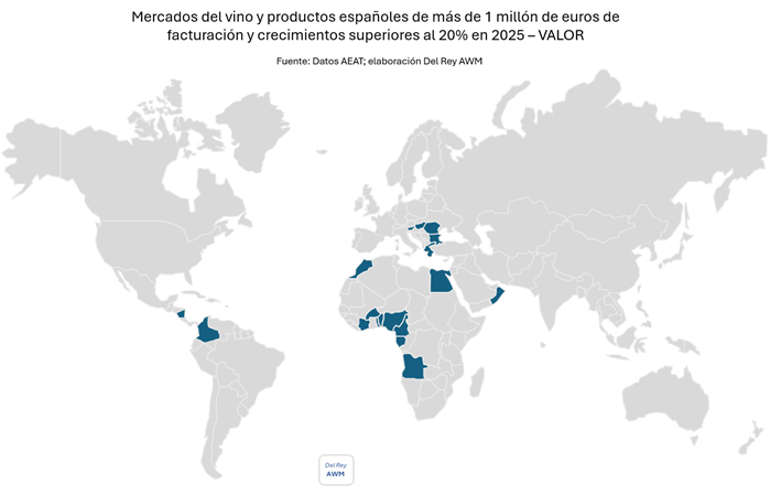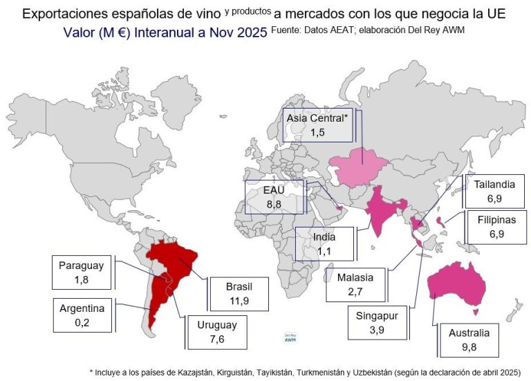 Para el vino español, los datos de la AEAT, analizados por del Rey AWM, muestran que la suma de estos mercados supone un total de 78, 4 millones de euros, equivalentes al 2,26% del total de las exportaciones españolas de vino y productos vitivinícolas en el interanual a noviembre del pasado año.