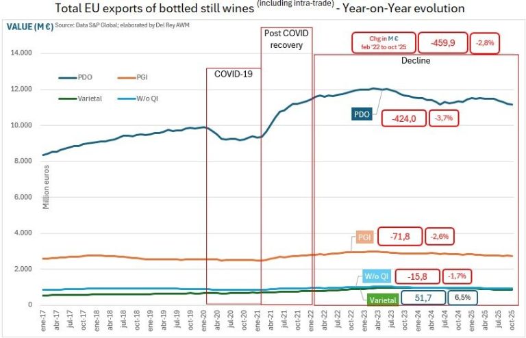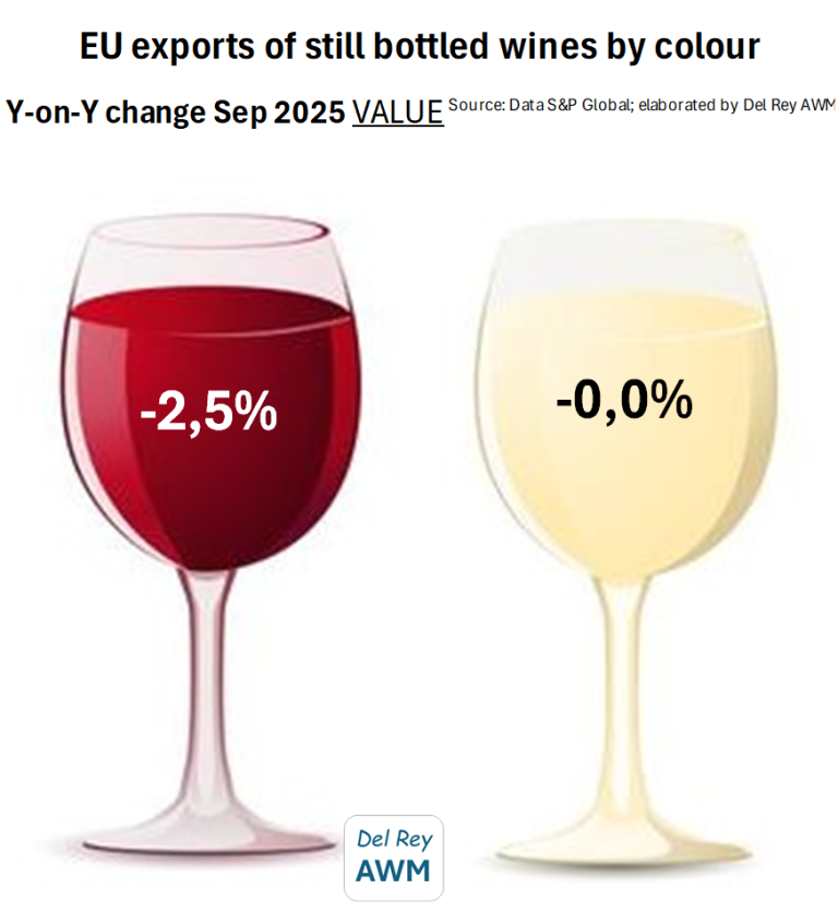 According to figures published by official sources and compiled by S&P Global, with analysis from del Rey AWM, total exports of still bottled wines from EU countries fell to €15.75 billion over the twelve months ending in September 2025. Of this total, white wines accounted for approximately one third, or €5.4 billion, while red and rosé wines combined represented two thirds, amounting to €10.35 billion.