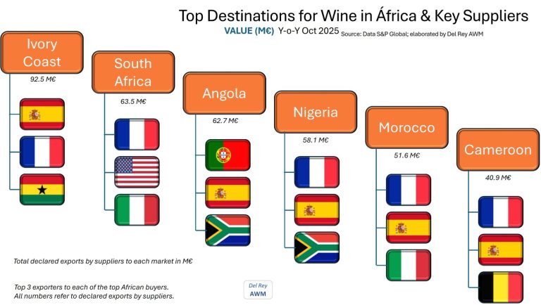 According to official customs data from most countries in the world, global wine exports to African markets have experienced remarkable growth over the past eight years. Overall, there has been a 43% increase in the value of these exports between 2017 and the 12-month figure at October 2025, while the volume has risen by 21%. These numbers have been adjusted by Del Rey AWM to account for inconsistencies in the official data reported by several countries, as well as re-exports from Togo and Ghana. The significant rise in export value is largely attributed to the substantial revaluation of wine exports, particularly following the COVID-19 pandemic